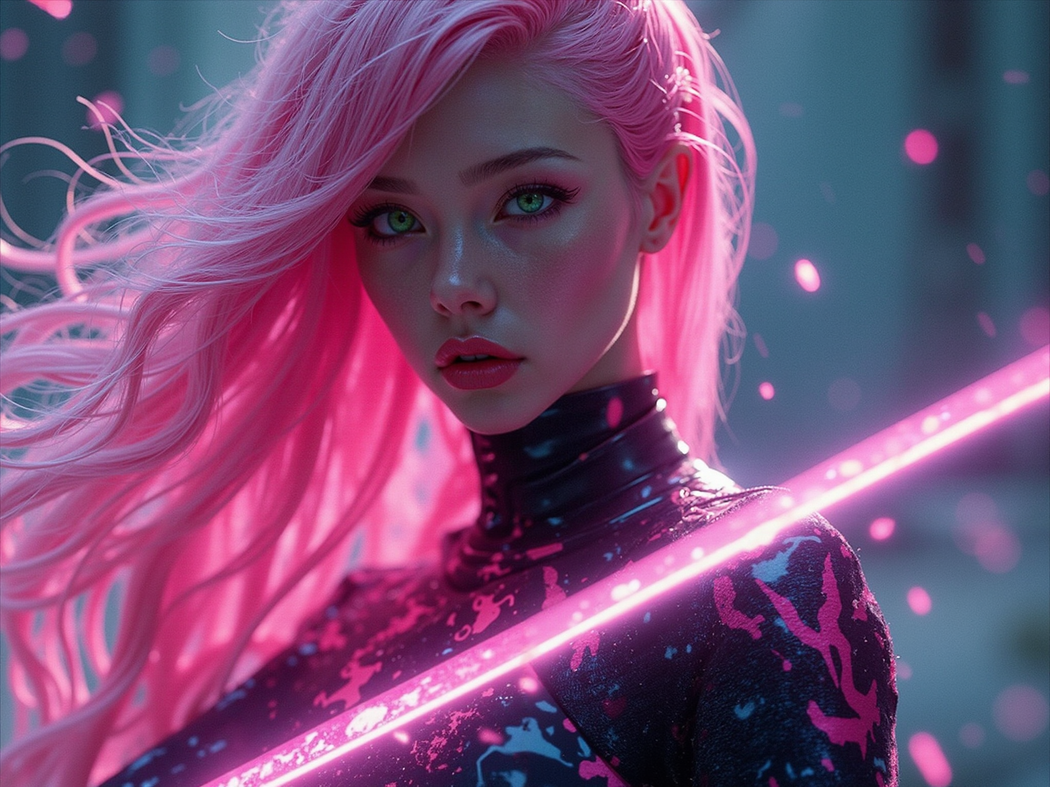 high quality, holding a katana, a mesmerizing 20-year-old woman with a futuristic beauty and green eyes, intricately woven into her very being, encased in the cybernetic suit, move with fluidity and precision, Her flowing pink hair resembles streams of neon lights, casting a vibrant glow that adds a touch of cyberpunk brilliance to her appearance, Each strand of hair is meticulously crafted with holographic patterns that shimmer and shift, creating an ever-changing display of colors, watercolors