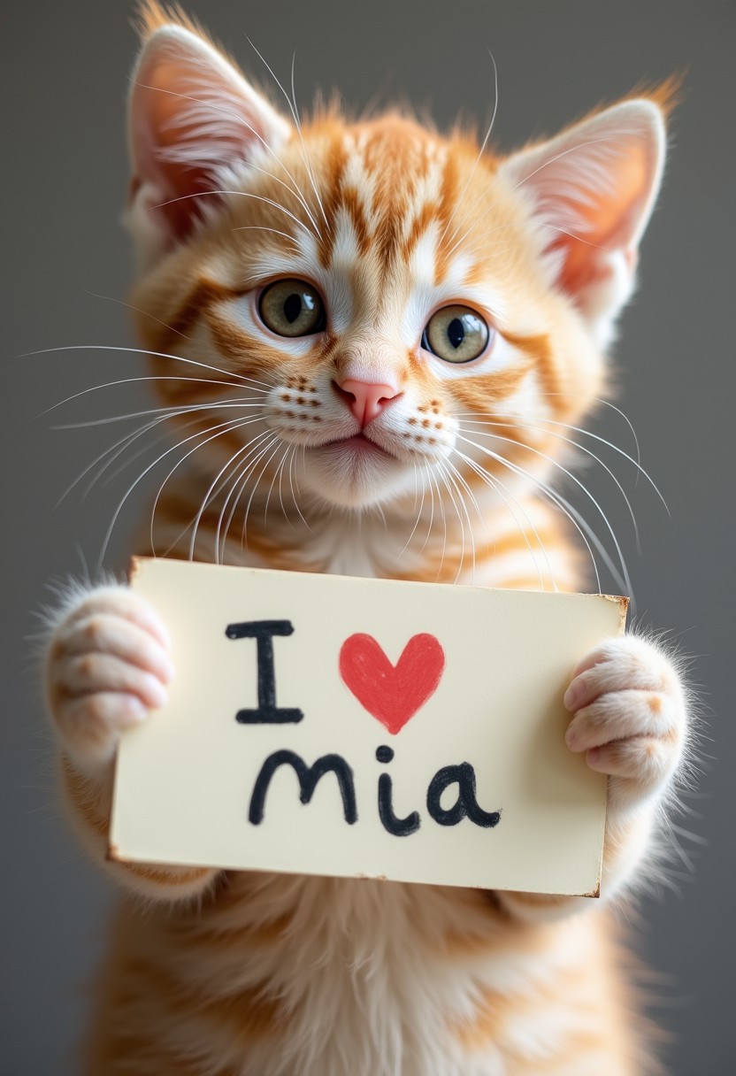 A symmetric portrait of a cute cat holding a sign text says "I Love Mia"