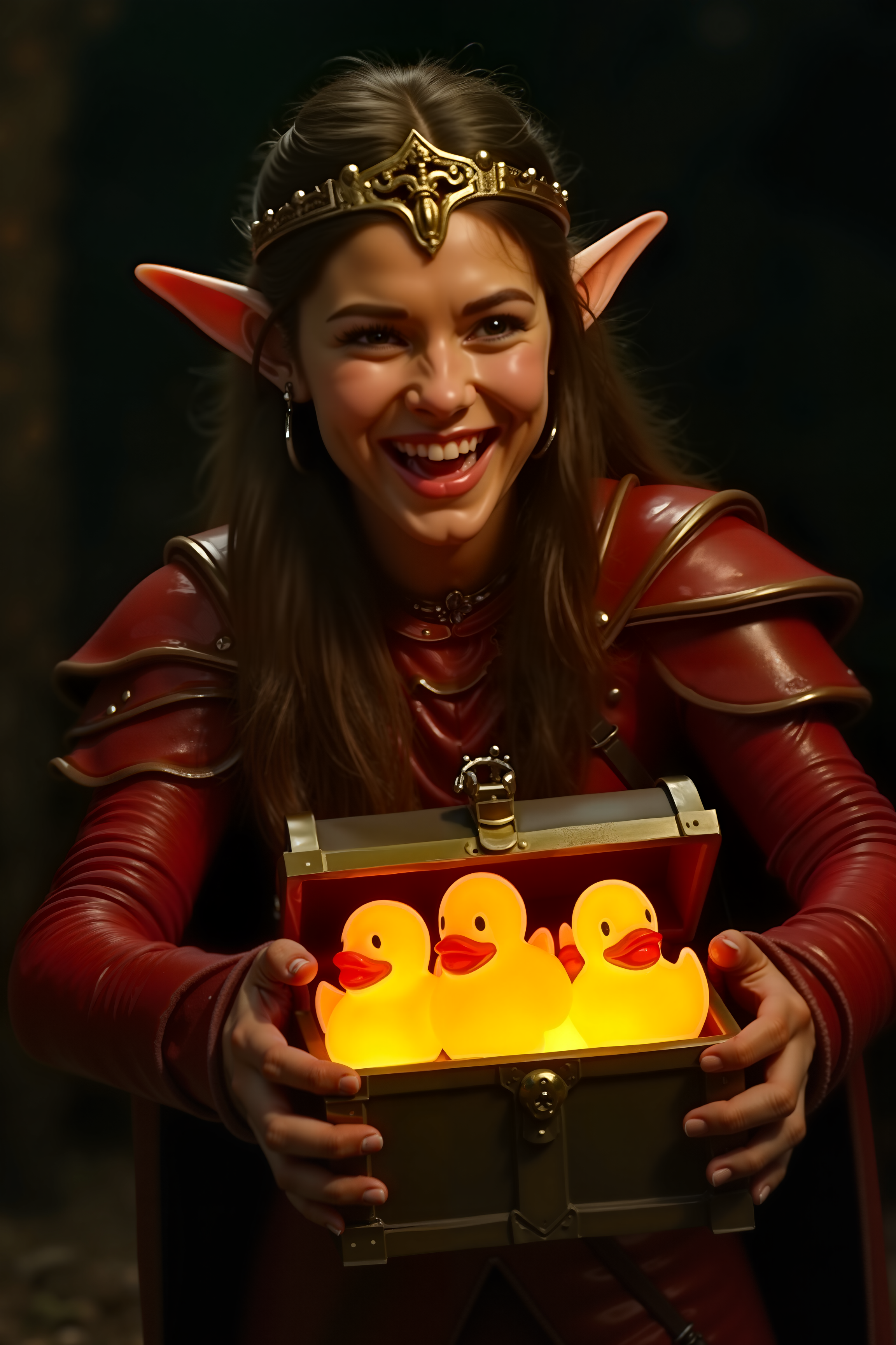 Movie still, close up of a female elf D&D adventurer in red leather armor and a golden tiara, opening a treasure chest with magical glowing rubber duckies inside. She is joyful, smiling, and delighted