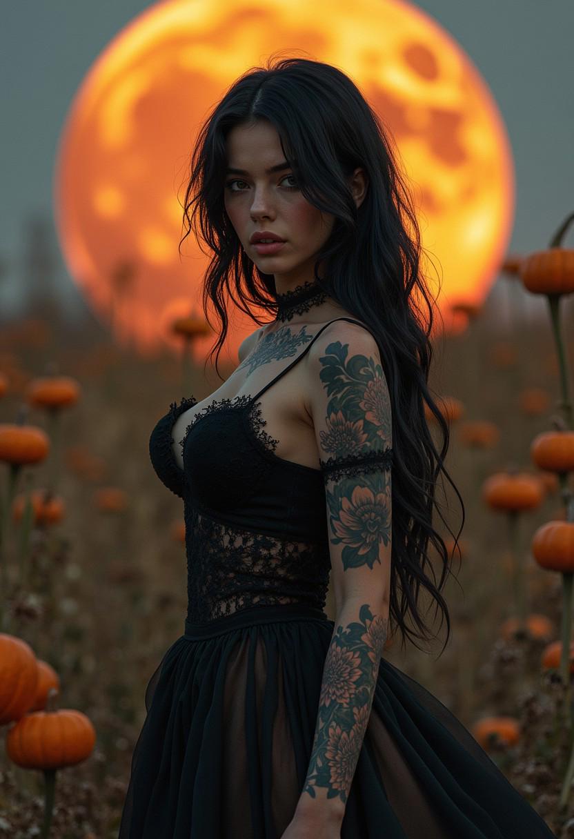 realistic style photo, surreal images,higher resolution textures, 4k graphic resolution, high detailed shading,gigantic breasts,plump breasts,gothic,Desert floral set, Headless Harvester, Cursed farmer, reaping souls with a pumpkin head under the harvest moon,backboob,1girl, fit,athletic,arm tattoo,Alluring pixie cut,long hair, black hair,big ass,bubble butt, (goth girl), (sexy goth girl), tattoos, gigantic natural breasts, hips, flat tummy, cinematic angle, cinematic lighting, thick thighs, perfect bubble butt visible under clothes, revealing ass cheek,revealing clothes, undercheek,