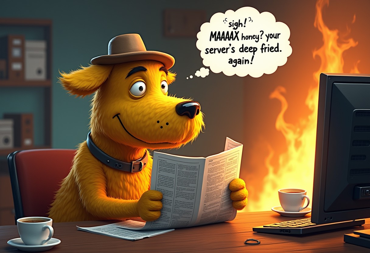 realistic, a yellow dog with a tiny hat on top of its head and a newspaper drinks coffee in a burning IT room, distracted from reading the newspaper, a monologue bubble with the text "*sigh* MAAAAX honey? your server's deep fried again"