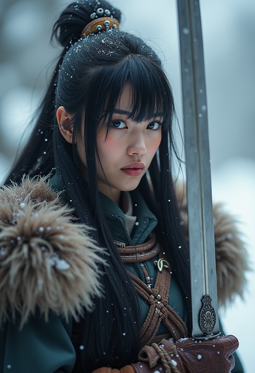 detailed photorealistic digital image, HD32K, wallpaper, 4K, 8K, abusrdres, masterpiece, perfect hands, detailed face, realistic skin texture, face in sharp focus, BREAK a stunning oriental barbarian warrior, with long dark hair, bangs, a circlet, fur trimmed leather armour, holding a sword by the hilt, facing a yeti in a snowy mountain valley during a snowstorm,, great lighting