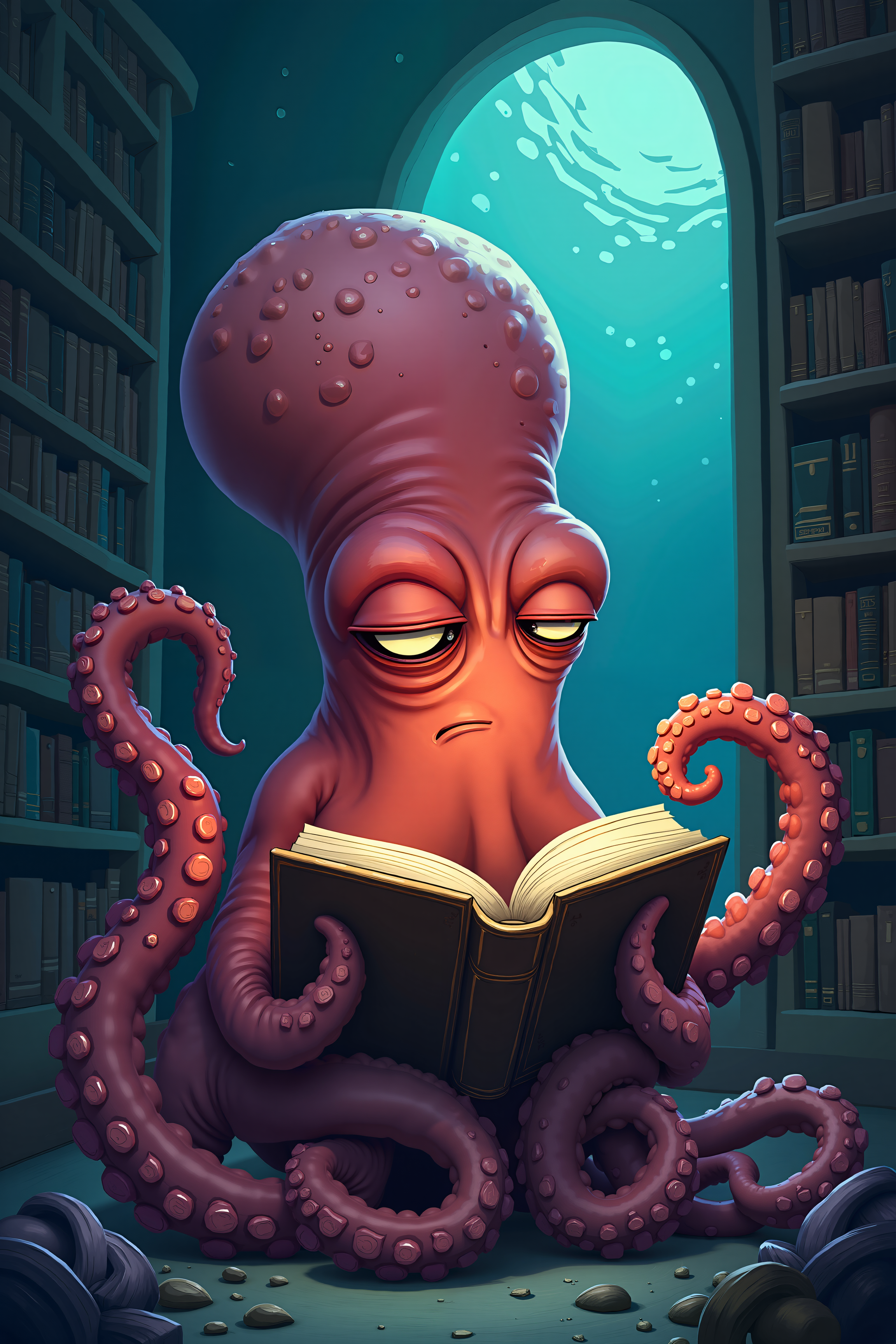 A grumpy octopus reading a book in a cozy underwater library