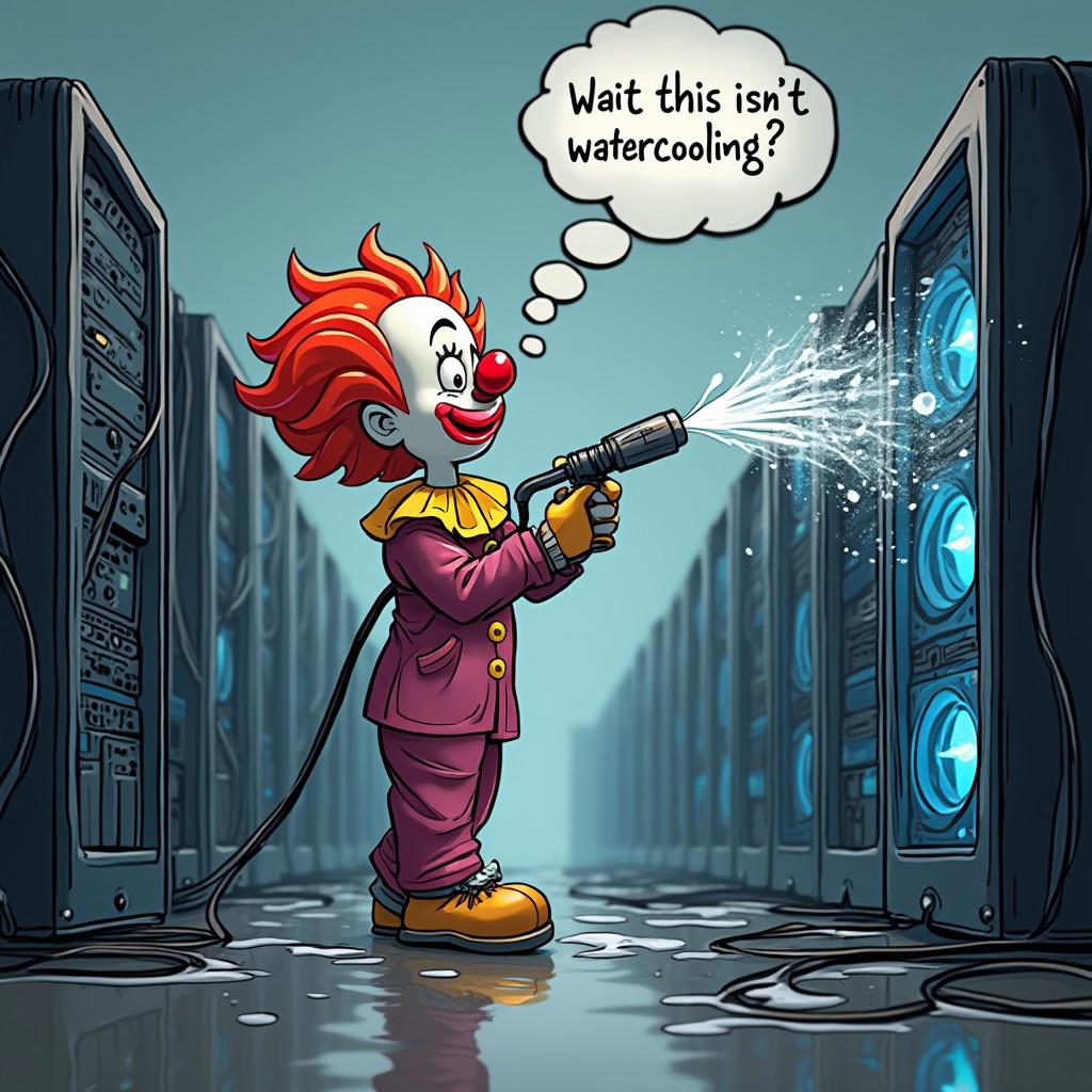 (ultra realistic,32k, ultra sharp,masterpiece:1.2),(high detailed skin:1.1),( high quality:1.1),(ultra high res:1.4), (beautiful lighting:1.4), (dynamic angle:1.6), cartoon Clown spraying water all over computers and computer servers with a hose, wires, with speech bubble text saying "Wait this isn't watercooling?"