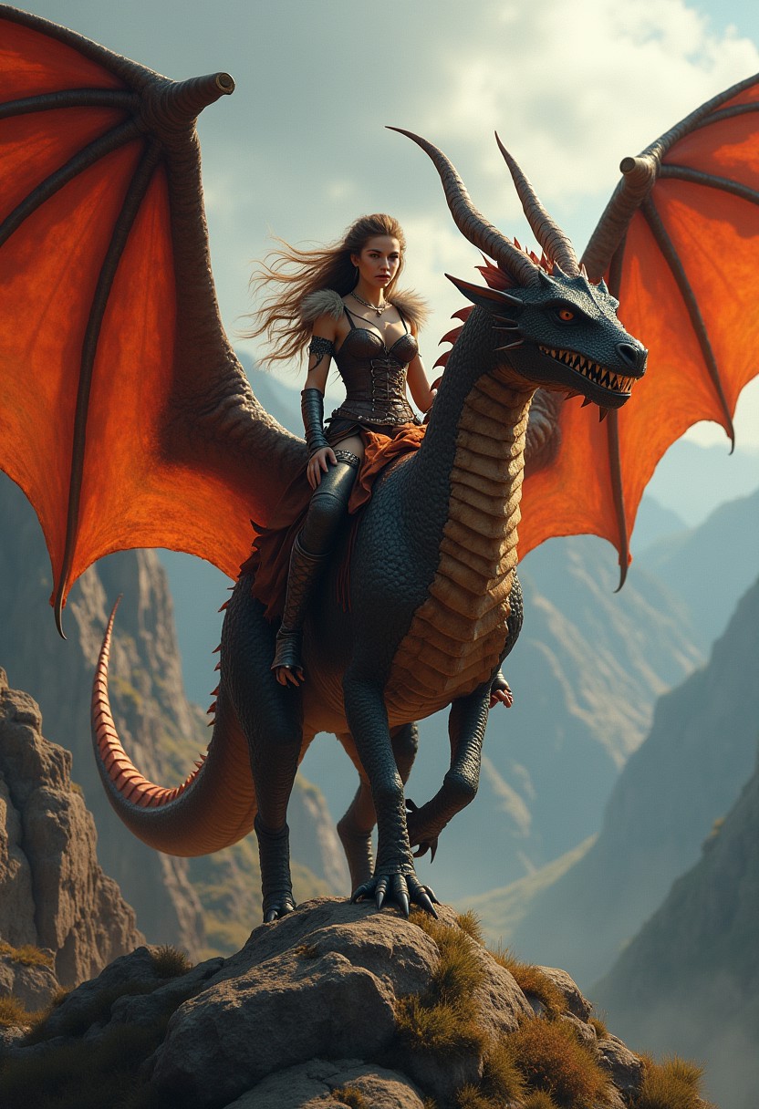 A stunning barbarian female dragonrider wearing leather armor, fur and lace clothing, riding on the back of a majestic fire dragon over a steep valley. High Detail, Perfect Composition, realistic photographic image, sharp focus, complex lighting