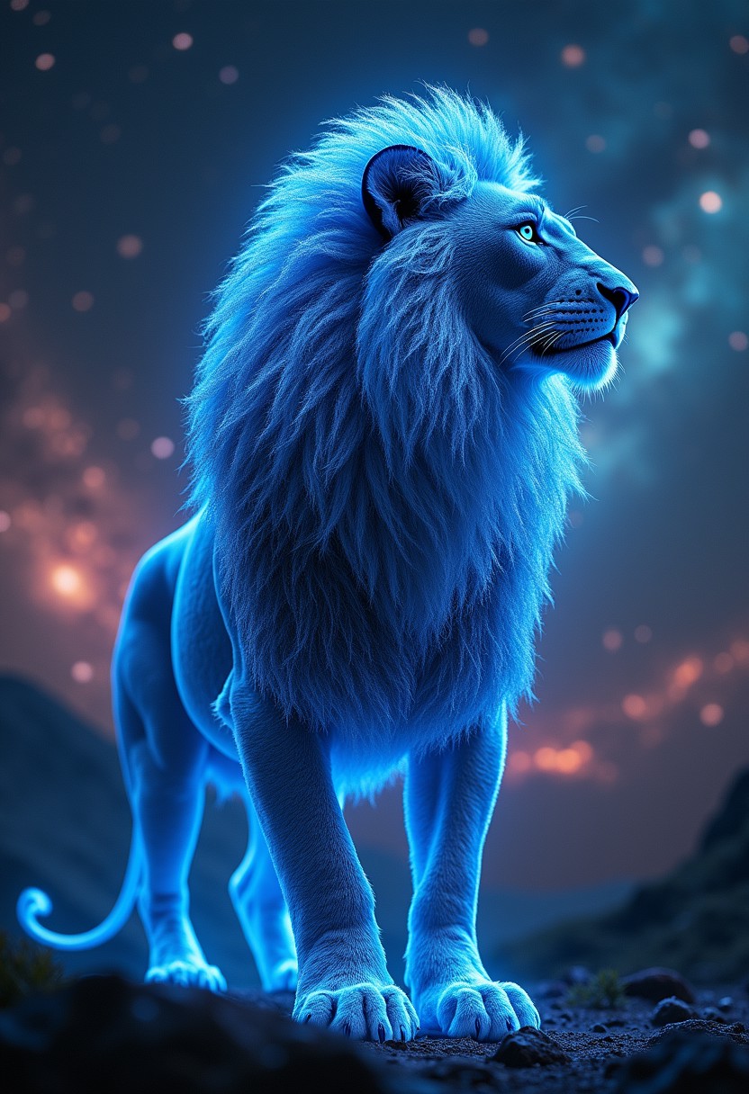 Dominating the scene is a translucent dark-blue lion adorned with luminescent fur, blending seamlessly with its surroundings. Its maine, composed of intricately woven energy threads, shimmer in a spectrum of colors. Starry sky. Amidst the night, its presence exudes a sense of mythical power. Behind it, the swirling hues of a distant galaxy provide a mesmerizing backdrop,