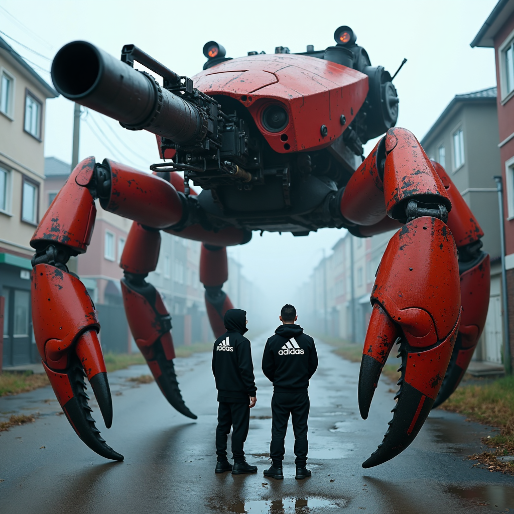 cinematic film shot, cinemaphotography, Crab mech with multiple large mechanical legs, have giant hot heated machine gun, in a russian neighborhood and 2 impressed guys in sports black adidas pants and jackets standing under him, 8K, high resolution