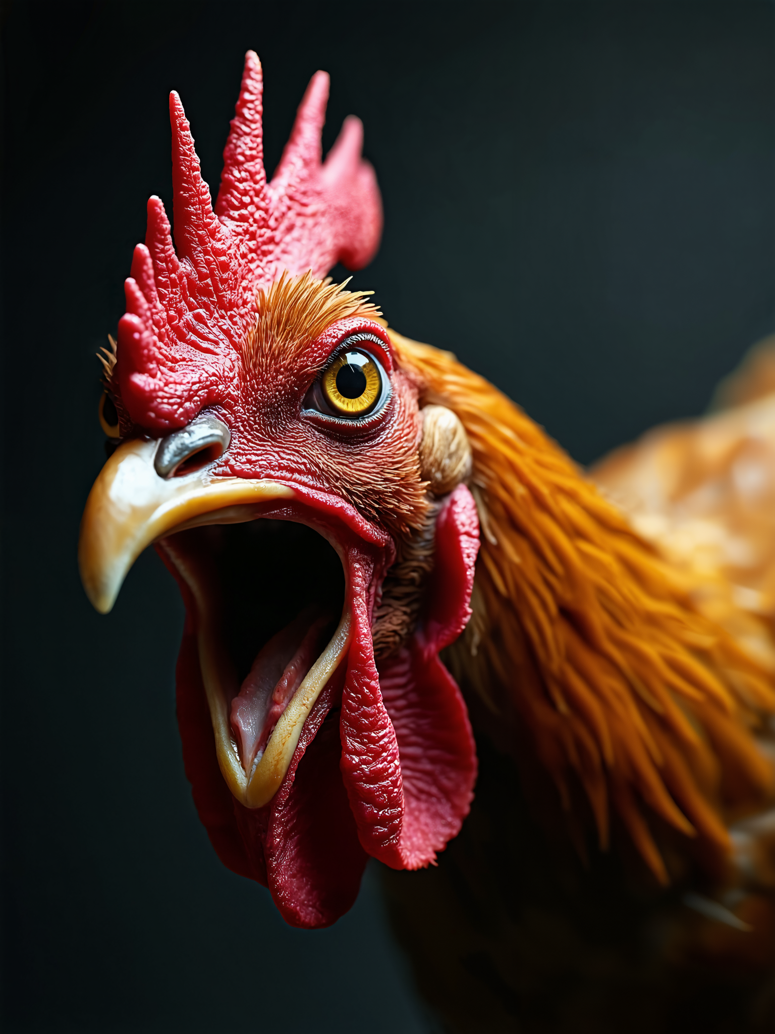 A hyperrealistic, ultra-detailed portrait of a screaming chicken with razor-sharp teeth, vibrant plumage, beady eyes filled with terror, set against a pitch-black background. Studio lighting emphasizes its menacing expression. Inspired by horror surrealism, evoking an eerie, unsettling atmosphere.