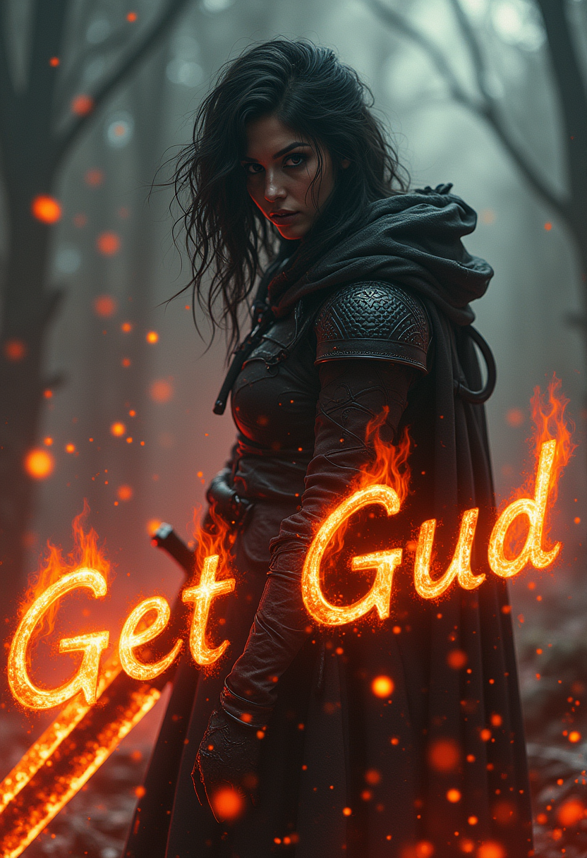 Detailed, masterpiece, professional, bold colors, awe inspiring, photography inspired by Jeremy Mann and Kelly McKernan, 30mm shot, action scene, HDR, Dark Souls themed, epic atmosphere, female warrior against impossible odds, gloomy, infused with lava, feminine, inspired by Agnes Cecile, holding massive sword, "Get Gud" written in bold flaming text double exposure over background, meme