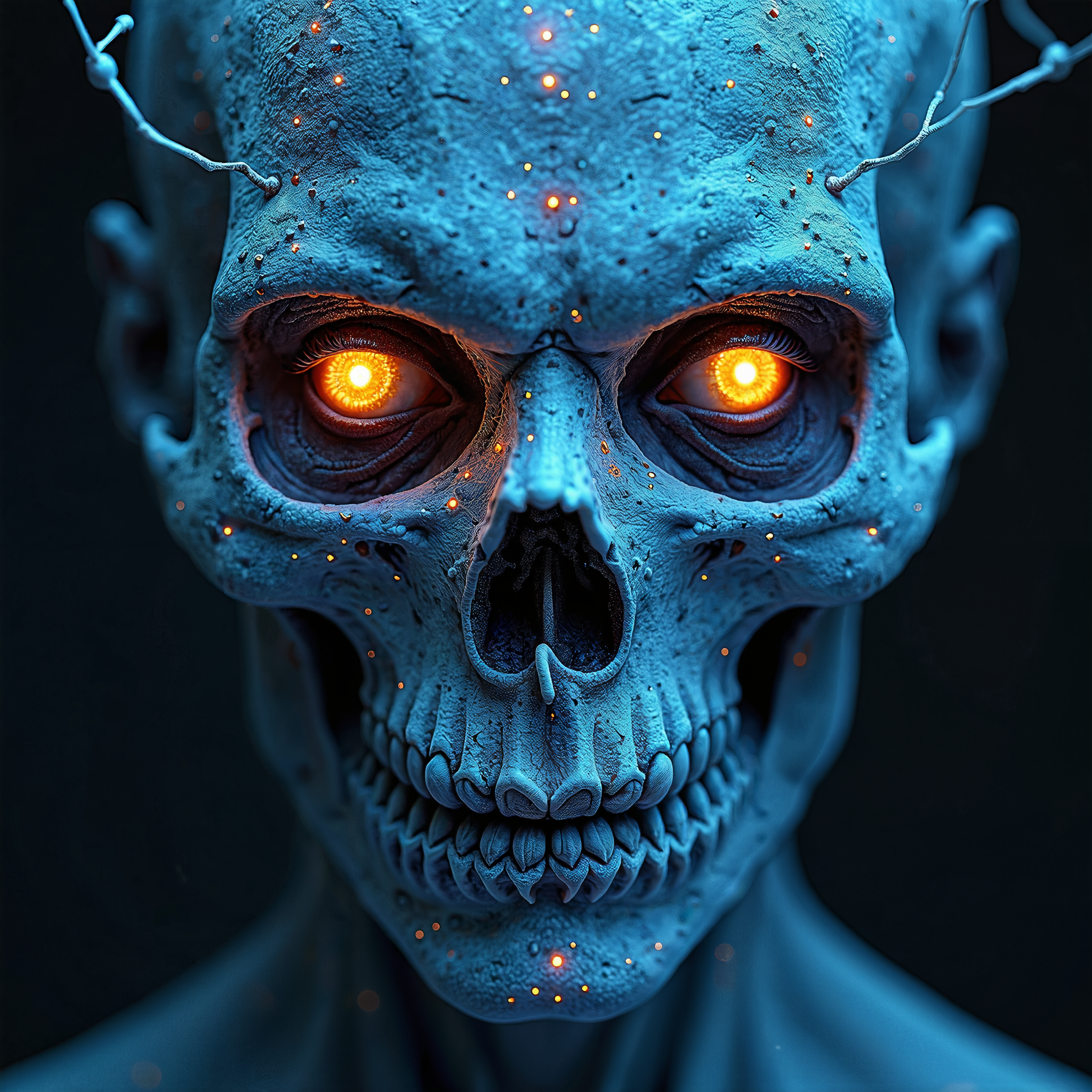 A symmetric portrait of an evil frozen necromancer, face dissolving into thin, luminescent blue lines of frozen magic, hyper-realistic with digital abstraction, intricate details. Shadows elongate, emphasizing depth, despair, and ancient power.