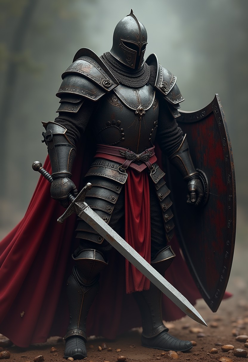 fierce dark knight warrior in a stance for battle, face obscured by his helmet, embodying the spirit of valor. Clad in blood-red black armor, Sword and shield, (detailed intricate plate armor), giant shield, (holding a shining sword), this epic figure exudes a sense of realism and intimidation. digital painting, boasts stunning 8k resolution, capturing every intricate detail with breathtaking clarity and intensity.
