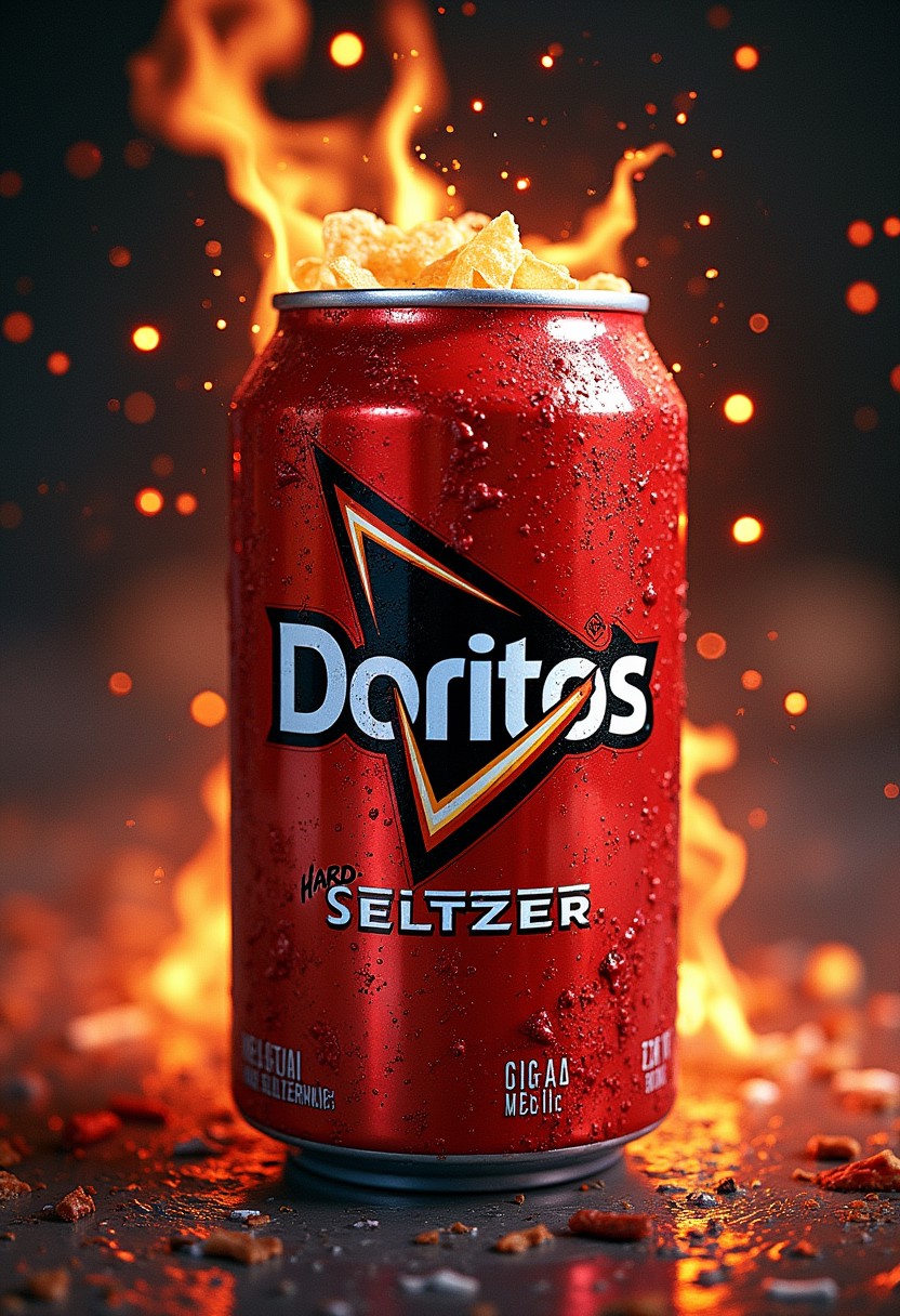 a print advertisement for doritos hard seltzer. the can of doritos hard seltzer should be prominently featured, and the motif of the ad should be gritty and extreme, like 1990s imagery.