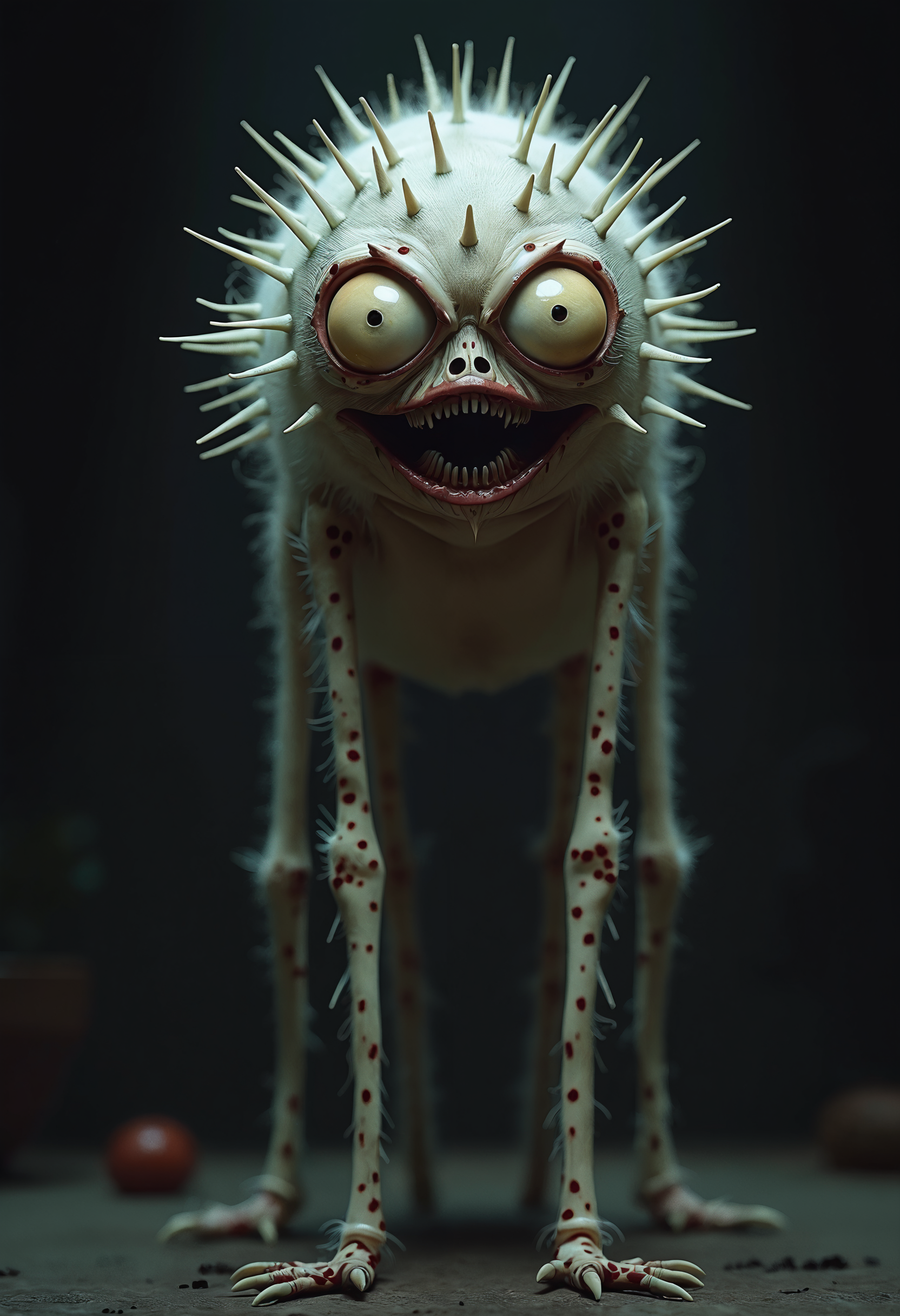 frightening creature, oversized eyes, fuzzy body. translucent nodule skin, insectoid antennae. long skinny boney legs, clawed feet. Spikes around eyes, spotted texture. Hyper-detailed, volumetric lighting, dark background. bizarre