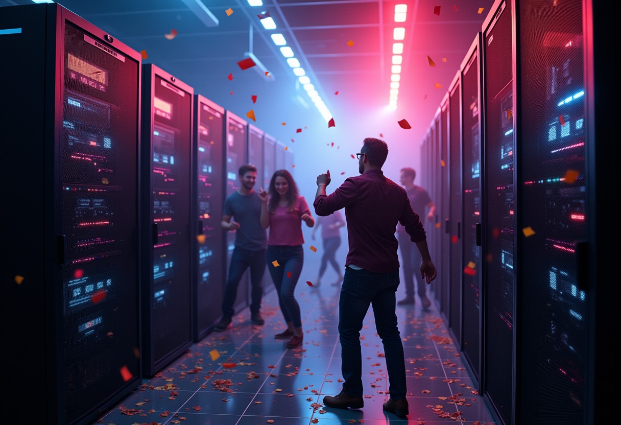 A wild party taking place in the server room, with servers dancing, flashing lights, and confetti flying everywhere. Caption: “Oops, our servers are having too much fun right now! We’ll be back soon!”