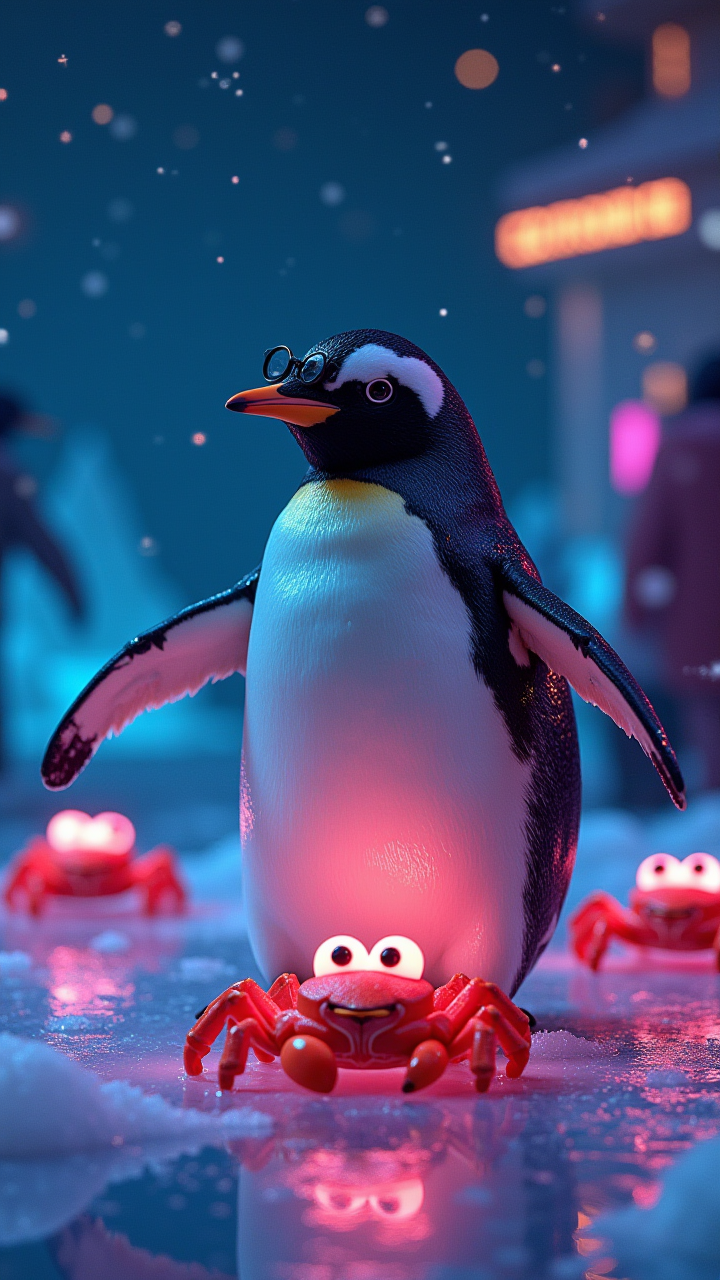 "Neon-lit penguin with a monocle conducting Space crabs on an ice-covered disco floor