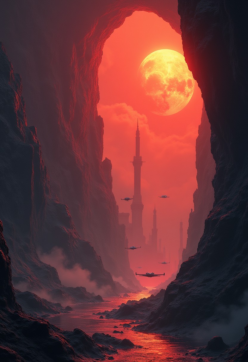deep stone cavern, red sky, intricate, concept art, smoke rising in background, large buildings, flying cars