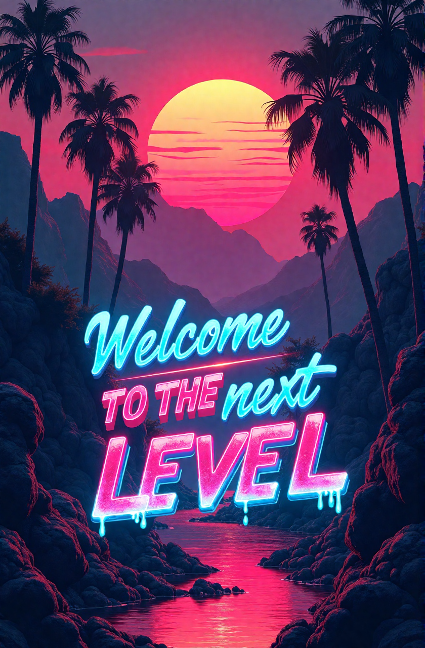 retro gaming futuristic sci-fi, 90s nostalgia. Night and sunset in neon colors, vintage cyberpunk illustration. Sun, mountains and palm trees. Retro VJ gaming landscape, Pro Photo Vibrant high-fashion photography featuring a bold streetwear-style graphic that masterfully interweaves vibrant graffiti art, urban motifs and spiritual themes, against a backdrop of rugged textures inspired by urban landscapes, with the phrase "Welcome to the next level" emblazoned in 3D glow textured frozen ice and red hot fire, graffiti-style metallic