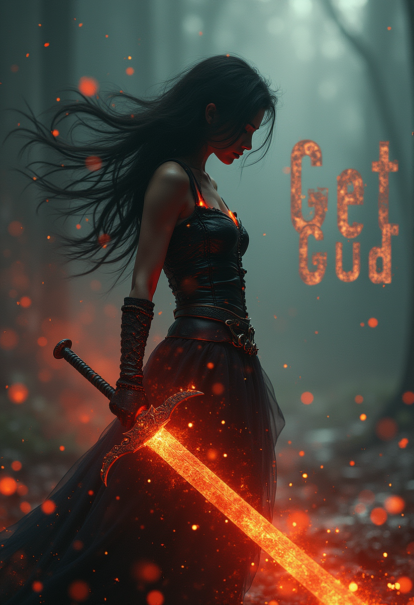 Detailed, masterpiece, professional, bold colors, awe inspiring, photography inspired by Jeremy Mann and Kelly McKernan, 30mm shot, action scene, HDR, Dark Souls themed, epic atmosphere, female warrior against impossible odds, gloomy, infused with lava, feminine, inspired by Agnes Cecile, holding massive sword, "Get Gud" written in bold flaming text double exposure over background, meme