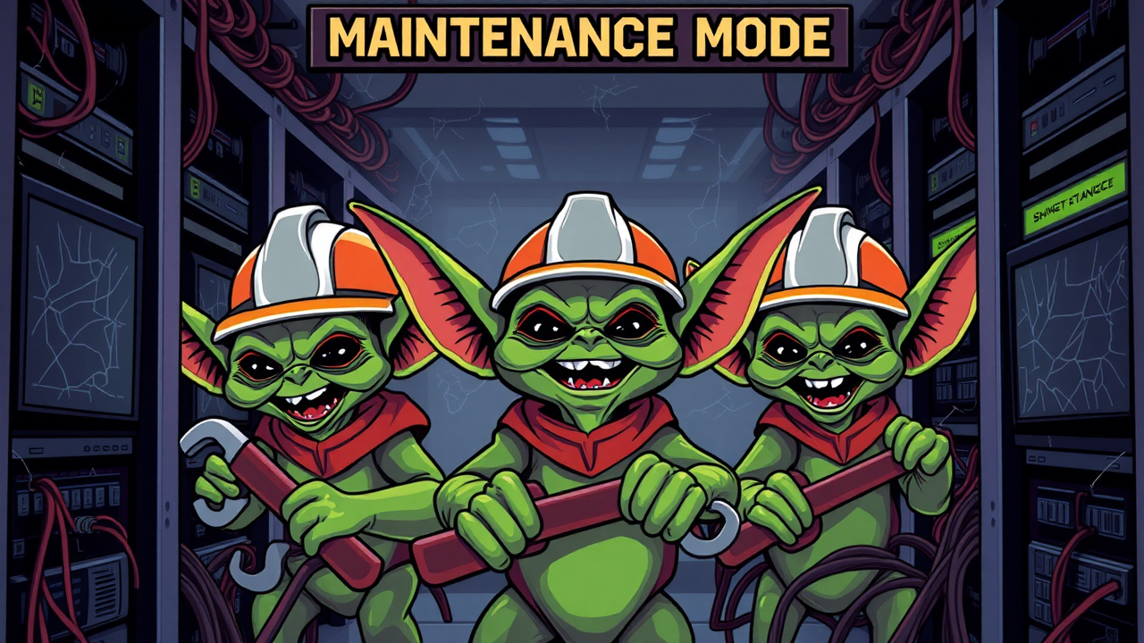 (terrifying 80's cartoon,32k, ultra sharp,masterpiece:1.2),( high quality:1.1),(ultra high res:1.4), gremlins wearing hard hats and holding wrenches at work in a server frame pulling wires and laughing, long ears, green skin, sharp teeth, evil black eyes, pixeled text at the top "MAINTENANCE MODE" in the center. data centers, computers, cracked monitors,