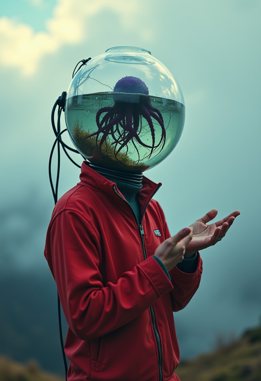 wired cyborg fishtank-head, person in Red Vintage tracksuit standing on a mountain top, hands reachinng to heaven, with a fishtank as head with a small dark-purple translucent octopus made of technical parts and wires in it, closeup, atmospheric haze, Film grain, cinematic film still, shallow depth of field, highly detailed, moody, epic, photorealistic, atmospheric lighting, billowing cloud backdrop with volumetric lighting from within ,