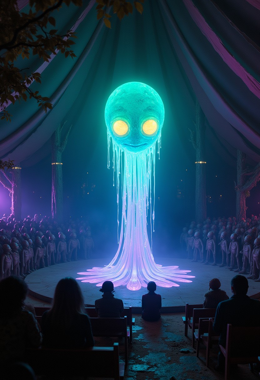 In the heart of Ripley's Spectacular Swamp Circus, a sentient slime mold named Gloom performs a mesmerizing light show. The Gloom, a gelatinous being with a soft glow, shifts into various shapes, casting vibrant bioluminescent pulses in shades of blue, purple, and green. The audience, a mix of frog people and other swamp creatures, watches in awe from rustic wooden benches. The circus tent, made of stitched-together leaves and vines, creates a magical backdrop, with twinkling fireflies adding to the enchanting spectacle. The atmosphere is filled with wonder, as if the very air is alive with magic, decaying animatronic, VHS screen grab, grainy, old footage, in the style of an old 80's VHS dark fantasy, VHS screen grab, grainy, old footage