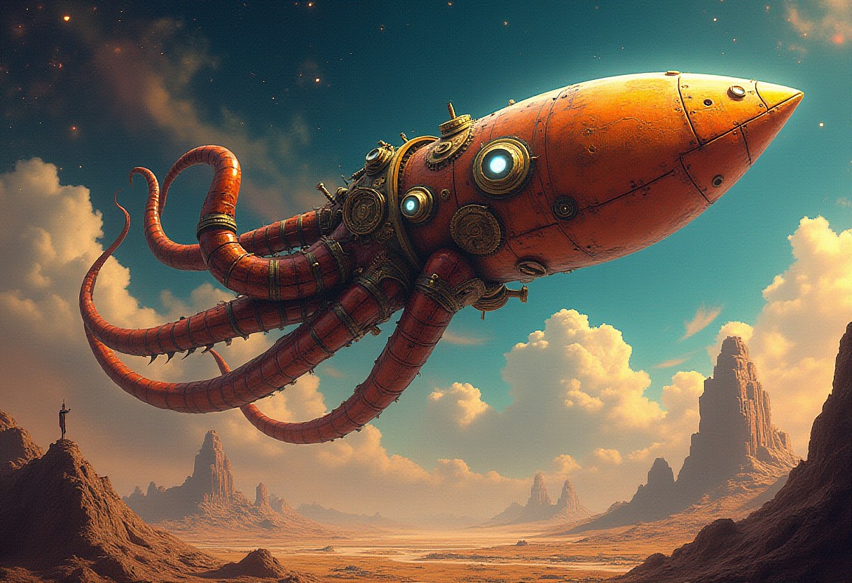 Steampunk sci-fi meets cyberpunk: A colossal bio-mechanical space squid, gleaming with brass and copper accents, hovers above a desolate alien planet. The creature's body is adorned with glowing portholes, intricate gears, and steampunk-inspired details. Vibrant, swirling nebulas and retro-style stars fill the background sky. The planet below features a landscape of sharp, geometric mountains interspersed with glowing cityscapes. Warm, golden light from the planet contrasts with cool, electric blues of space. Ray gun-era rocket fins blend with sleek, futuristic design elements on the space squid. Hyper-detailed textures combine polished metal with organic forms. Color palette mixes muted retro tones with vivid cyberpunk hues. Style evokes classic sci-fi book covers with a modern, digital art twist.