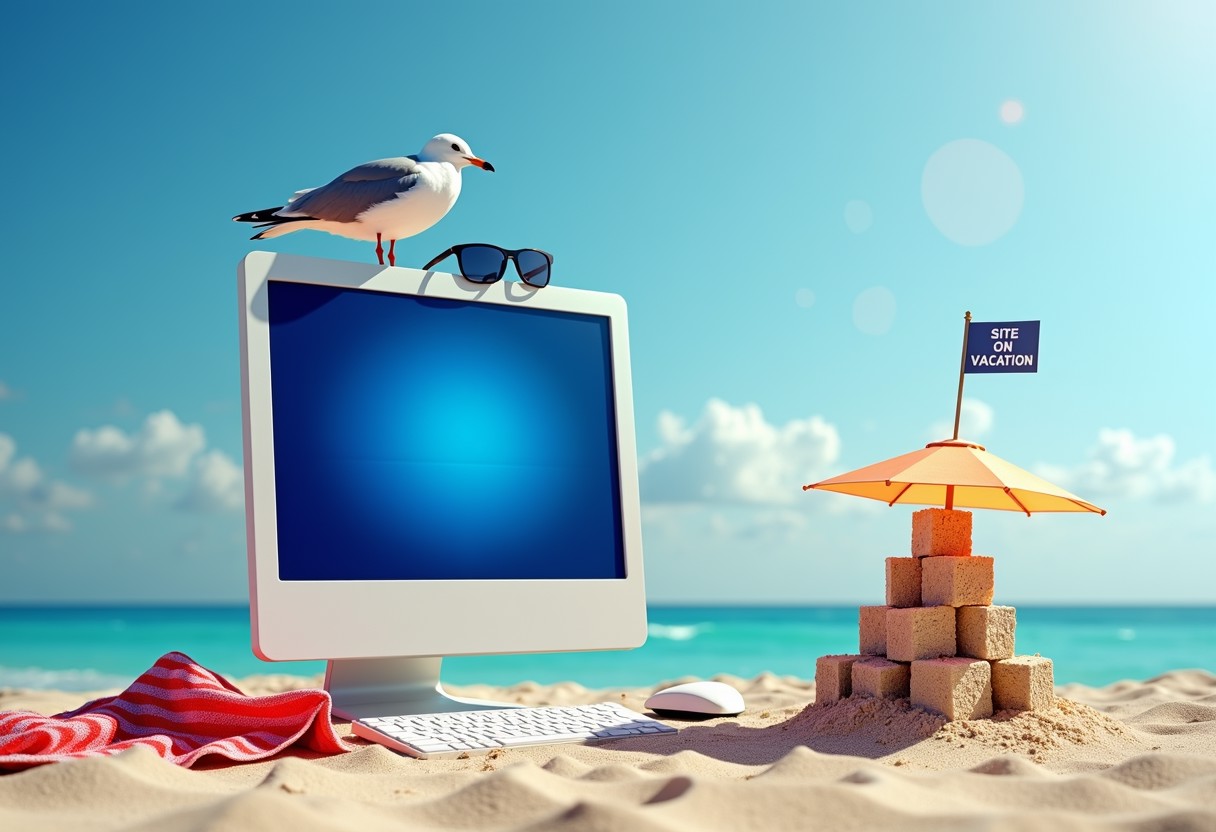 Capture a hyper-realistic photograph of a sunny beach, but instead of a lifeguard tower, there’s a giant computer monitor displaying the classic blue screen of death. A beach towel is draped over the monitor, and a pair of sunglasses rests on top. Nearby, a sandcastle has been built in the shape of a server tower, with a tiny flag that reads, “Site on Vacation.” A seagull perches on the monitor, looking curiously at the screen, while a beach umbrella shades the keyboard. The scene is playful, with the idea that the site is taking an unexpected beach day, and humorously captures the downtime.