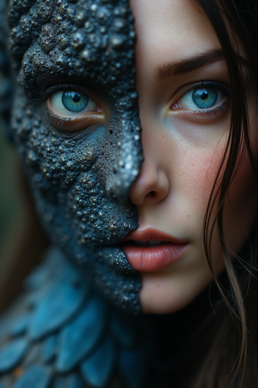 breathtaking highly detailed and professional closeup photographic portrait, at palace, a close-up of a mysterious woman, one half of her body and face is beautiful, human appearance, blue eyes, hair that is Mocha half-up half-down, the other half of her body and face is a Cassowary. Dark atmosphere, cinematic, masterpiece, clear focus.