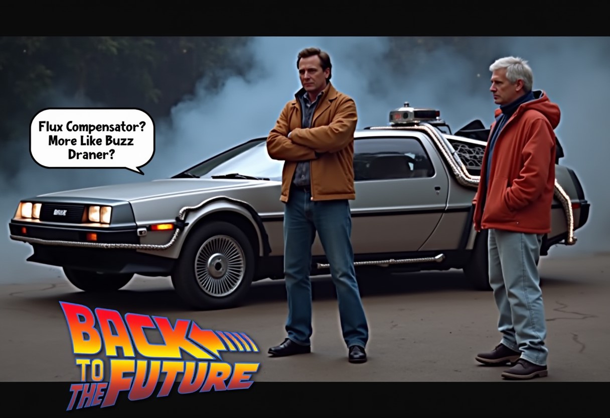A freeze frame from the movie "Back to the Future", Doc Brown and Marty McFly standing in front of a DeLorean, speech bubble from Doc Brown saying "Flux Compensator? More like Buzz Drainer!"