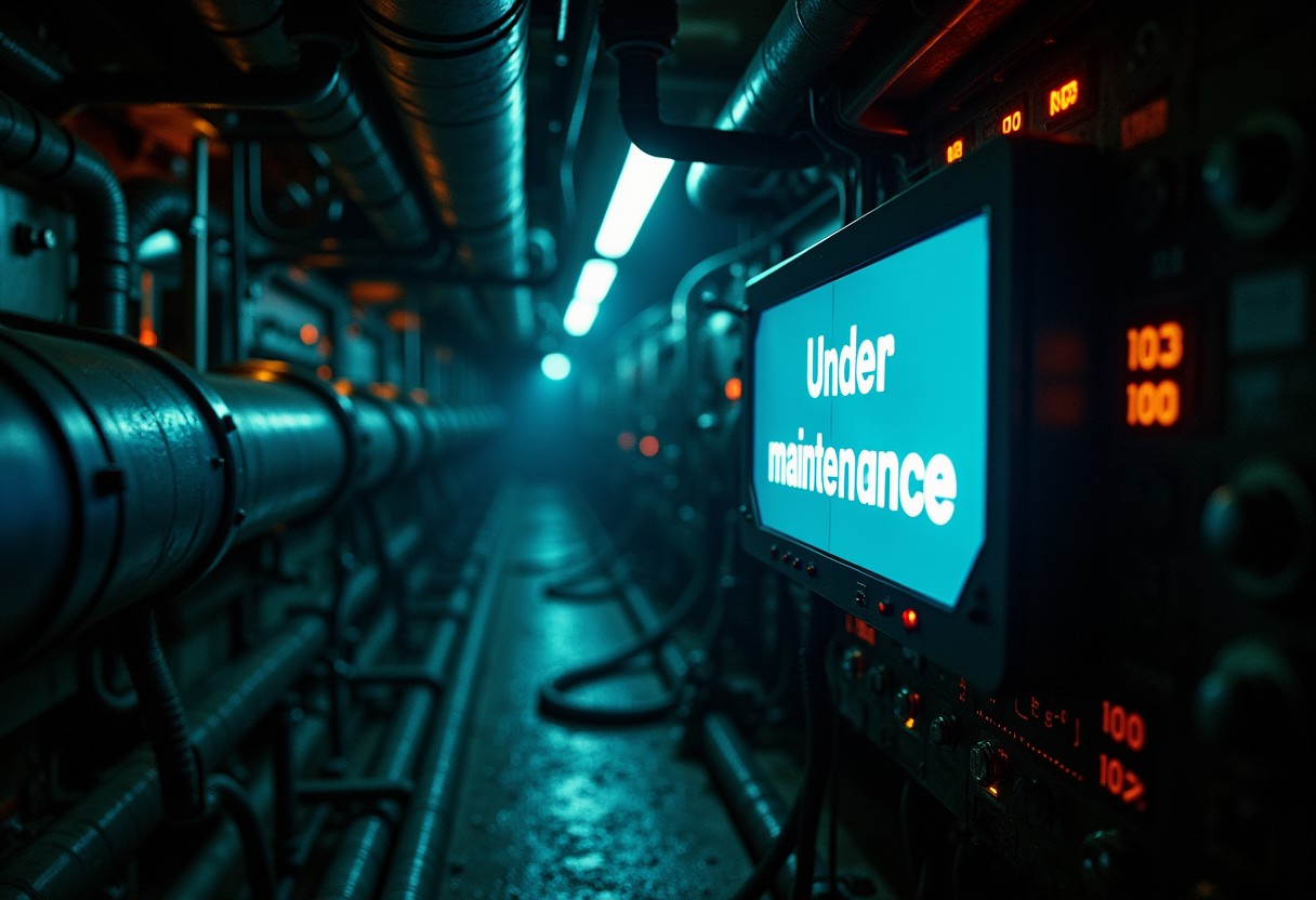inside a submarine. a screen displays the text “Under maintenance”. pipes, cables. leaks, waterways. short circuits, sparks.. dark lighting. neons. depth of field. cinematic. photorelist
