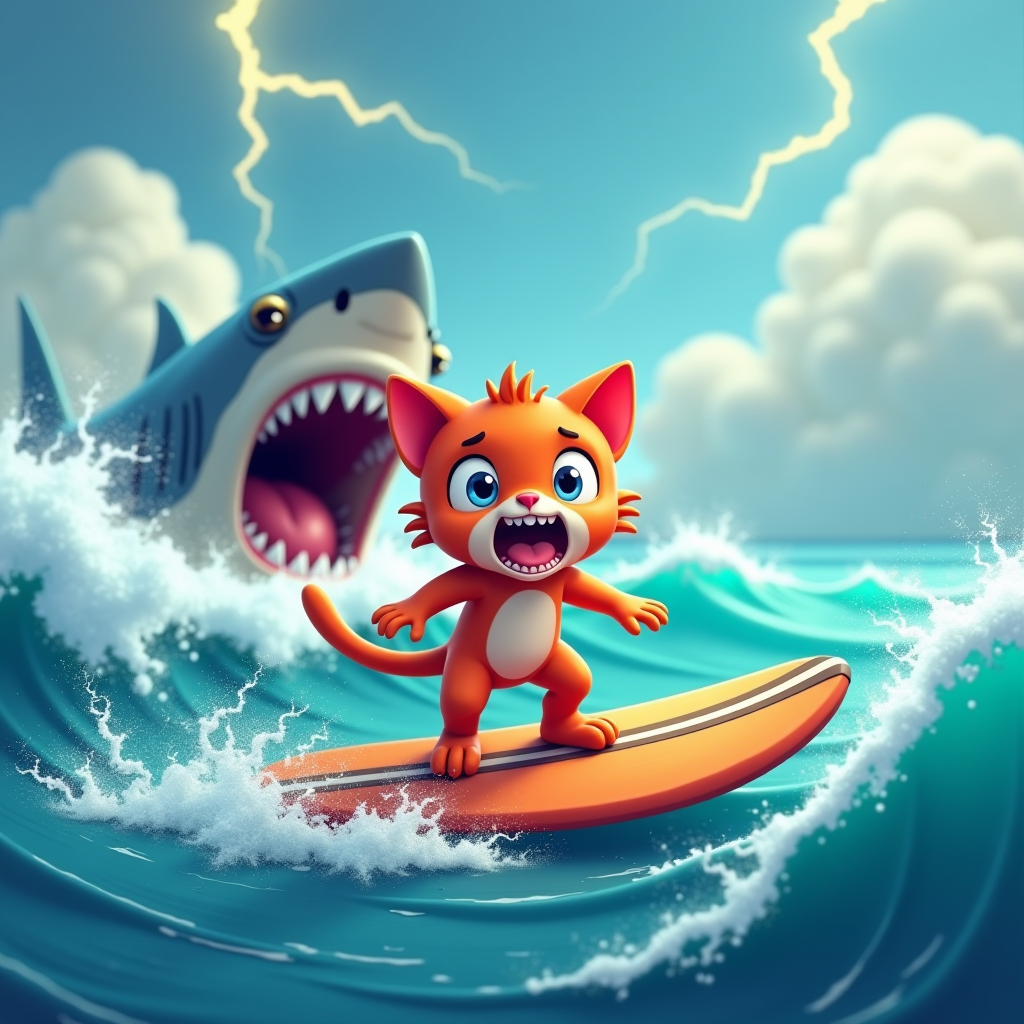 cinematic, A scared red kitten on a surfboard is sailing through the sea, being chased by an evil shark, big waves, clouds in the sky, lightning, close-up,