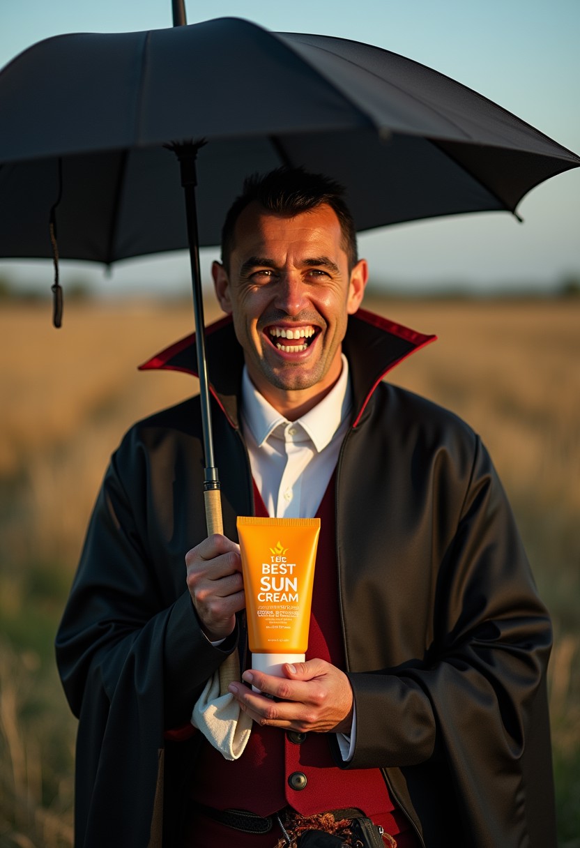 A contented vampire with an umbrella stands outside during the day and holds a bottle of sunscreen in his hands, the sun cream bottle says "THE BEST SUN CREAM IN THE WORLD", vampire fangs, advertising poster, professional photo, volumetric light, close up,