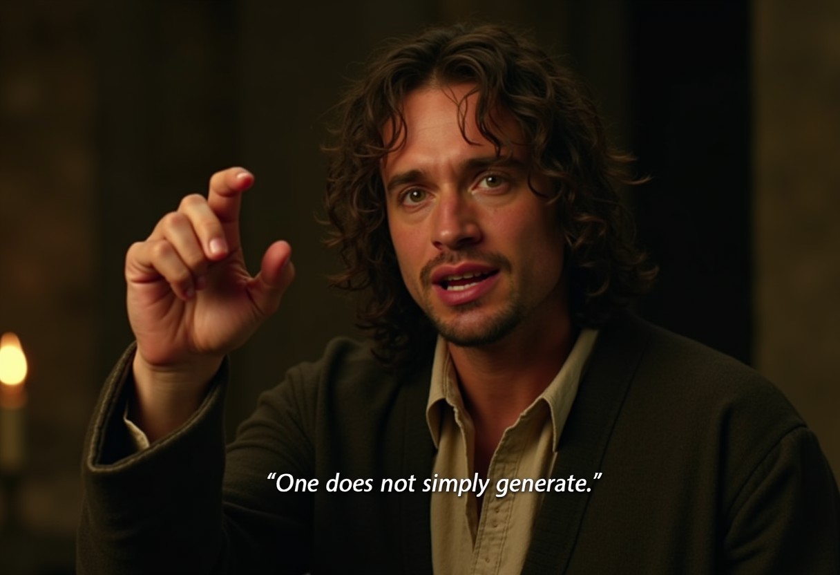 Lord of the rings cinematic shot of Aragorn with his hand up with his thumb and index finger together, speaking which his mouth open with small subtitles saying "One does not simply generate"