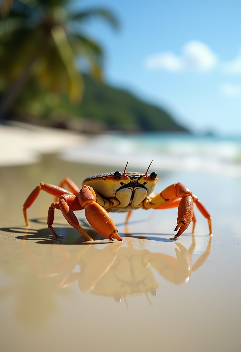 fiddler crab sifting for food in shallow water on a tropical beach, photorealistic, High Detail, Perfect Composition, viewed from ground level