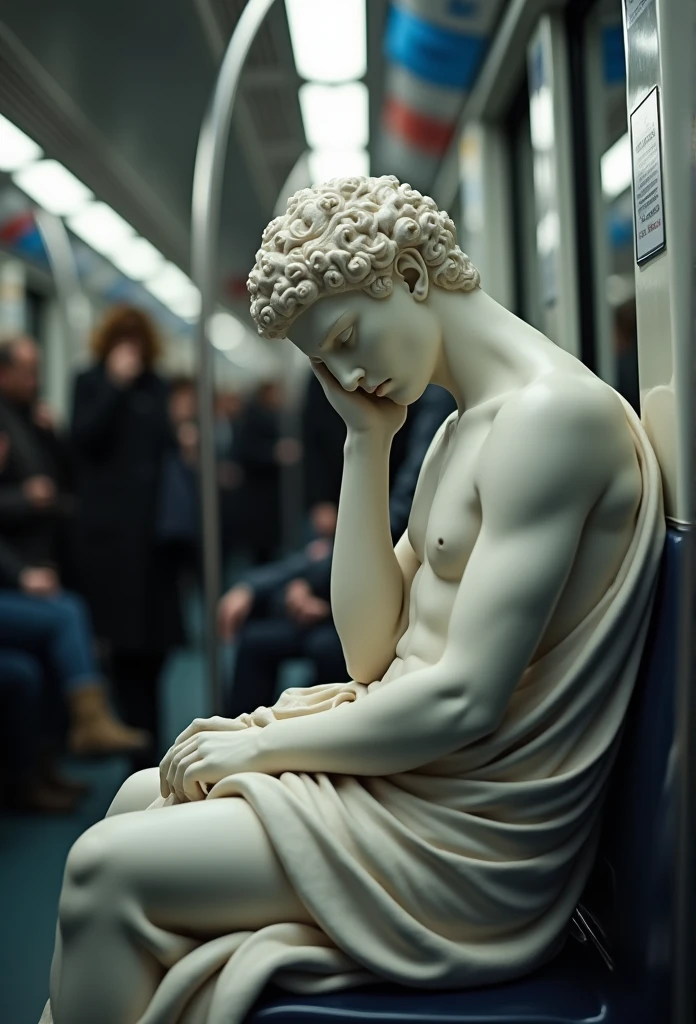 Greek marble statue sits in crowded subway train during rush hour, commute to work, sad expressions, intricate details, photo taken in Kyiv subway, creative photoshoot, unreal render 8k