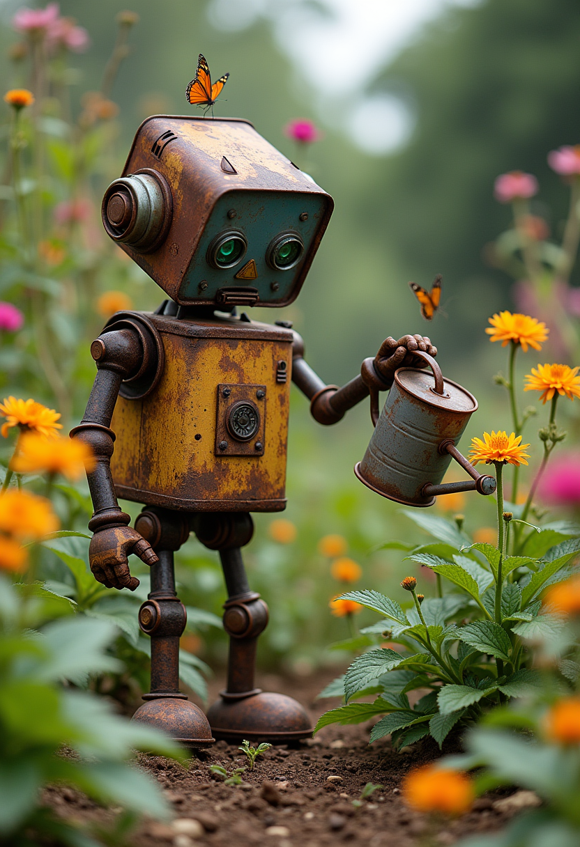 The same rusted can robot is in a vibrant, overgrown garden. It’s using its tin-can arms to water a single blooming flower with an old watering can. The scene is filled with colorful plants and butterflies, showing the robot’s gentle nature and the joy it finds in nurturing life.