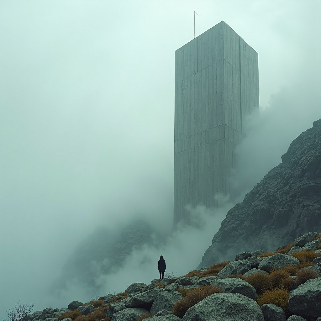 dreamscape misty cloudy top of the rocky mountain, a person standing against huge concrete simplistic shaped structure brutalism style, dull composition with faded colors, size contrast composition between huge abandoned building and a lonely person really small sized comparing to structure shaped by zaha hadid,towering polygonal concrete building by zaha hadid . surreal, ethereal, dreamy, mysterious, fantasy, highly detailed
