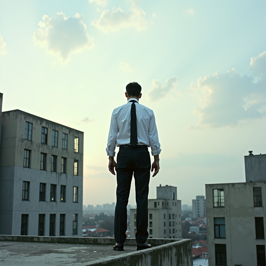 mamiya archive japanese film photography, office worker shirt and tie standing on the edge of the roof almost falling, photo behind the man wide angle, thought-provoking dynamic dramatic composition