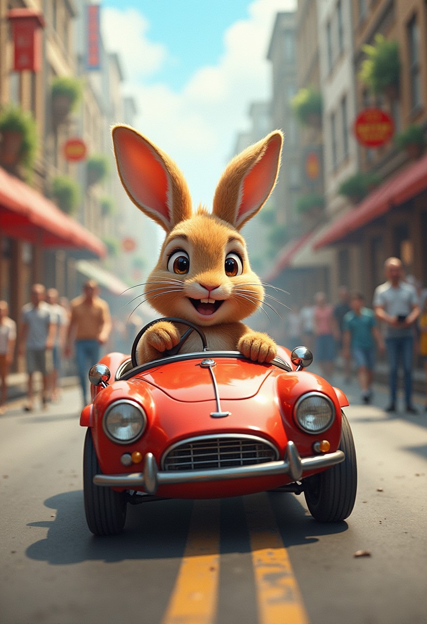 rabbit in a toy car, zooming through a busy street (masterpiece, award winning artwork) many details, extreme detailed, full of details, Wide range of colors, high Dynamic