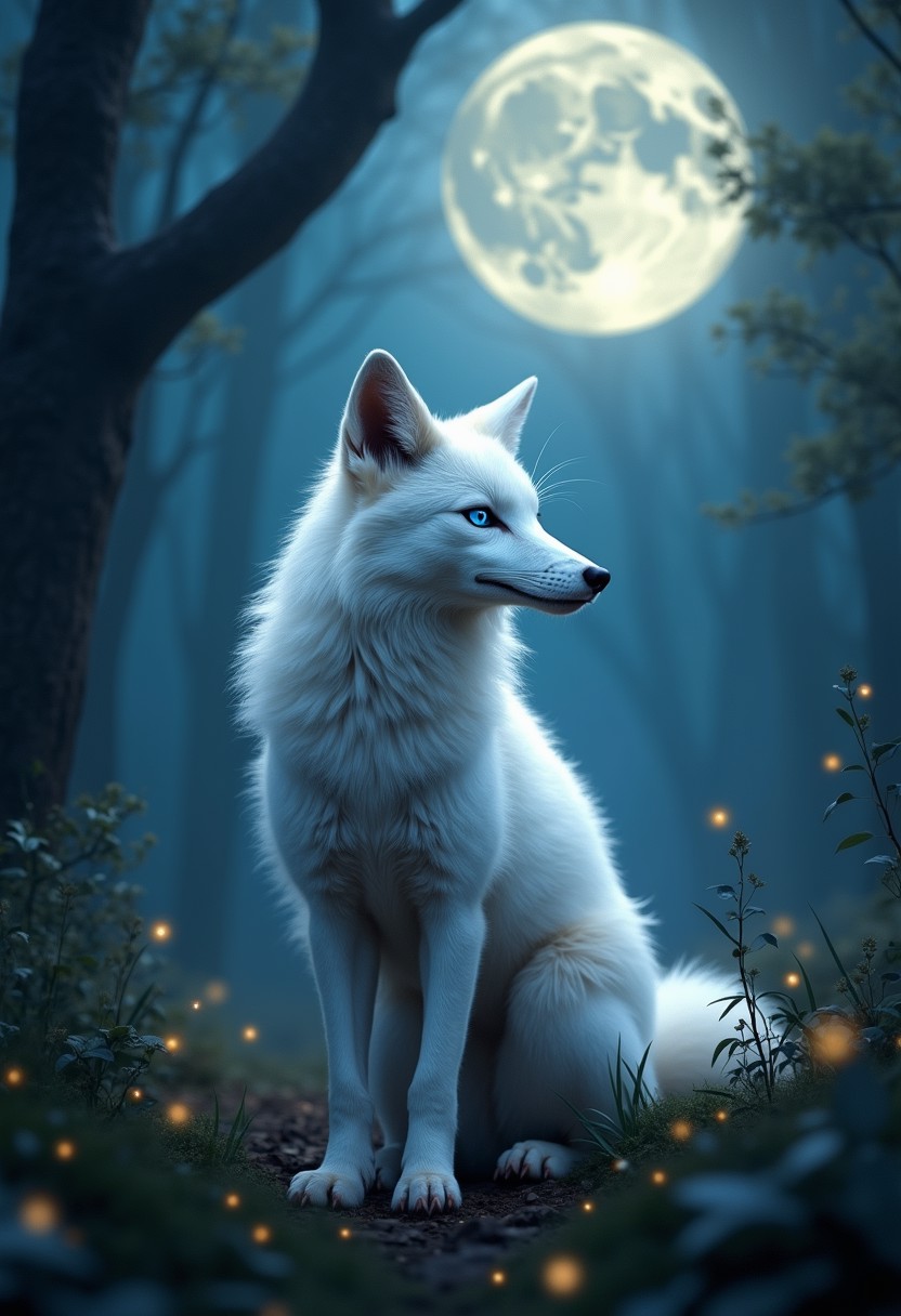A high-resolution, photorealistic image of an enigmatic white fox in a serene, moonlit forest clearing. The white fox has a sleek, pristine coat that glistens in the moonlight, with strikingly intelligent and piercing blue eyes. It stands poised and alert, exuding an air of mystery and grace. The moonlight filters through the trees, casting soft, dappled shadows on the forest floor. The background features ancient trees, lush undergrowth, and twinkling fireflies, adding to the magical and serene atmosphere. The composition includes a shallow depth of field, focusing sharply on the white fox, capturing its ethereal beauty and the enchanting forest setting.