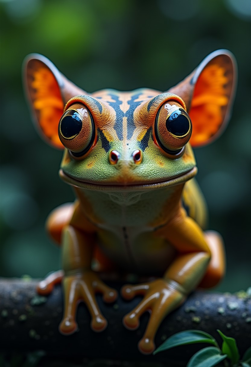 Close shot of fantasy animal named "tiger-butterfly"staring at viewer, surprised, half frog, half monkey, Nick Knight,Patricia Piccinini, Robert Rauschenberg,AES+F,hyper detailed,intricate, poster,artstation, Dark Jungle out of focus background, depth of field, bokeh