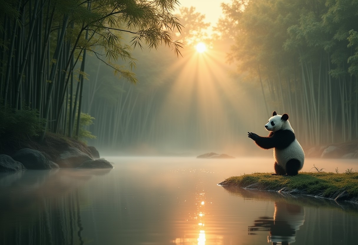tranquil pond in a bamboo forest at dawn, sun is barely starting to peak over the horizon, panda practices Tai Chi near the edge of the pond, atmospheric perspective through the mist of morning dew, sunbeams, its movements are graceful and fluid - creating a sense of harmony and balance, the pond's calm waters reflecting the scene, inviting a sense of meditation and connection with nature, style of Howard Terpning and Jessica Rossier,<lora:other/flux_realism_lora:1.0>