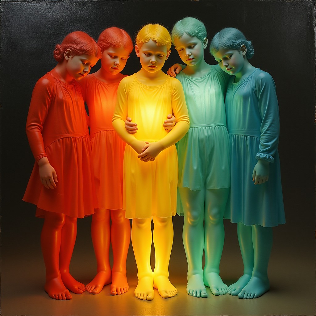 Painting of translucent sculptures of children with a light inside by William Adolphe Bouguereau and Ivan Pokidyshev, red green blue and yellow sculptures of people, Painting children with sculptures of children, people with sculptures, dress, shirt, pants, robes, people hugging