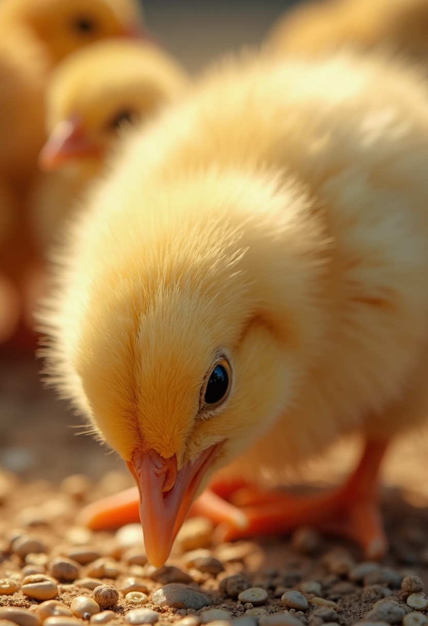 a (yellow chick) searching for food on the ground. The chick's feathers are (soft and fluffy), with a (light yellow) color, making it look very adorable. It lowers its head, focusing on pecking at the grains on the ground, with a few other chicks nearby. The background is in (soft warm tones), creating an atmosphere full of (warmth and tranquility). The chick's actions and expressions in the image convey a sense of youthful life and vitality, evoking a feeling of nature and innocence.