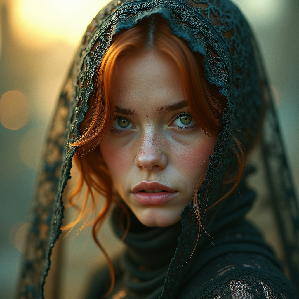 a woman with auburn hair, green eyes, intricately detailed veil, looking at viewer. double exposure, surreal, bokeh, cinematic color, epic composition, ambient light, golden hour