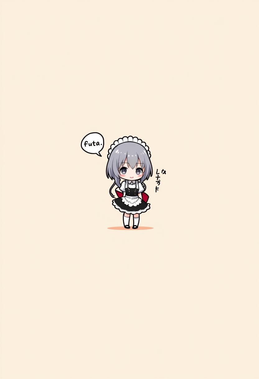 anime artstyle, 1girl, chibi, maid cosplay, beige background, simple background, looking at viewer, speech bubble "futa"