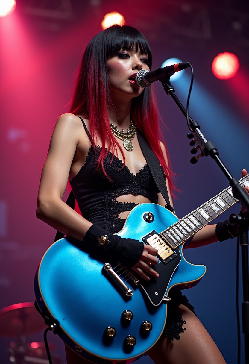 stunning, beautiful japanese heavy metal guitarist playing guitar and singing into a microphone on stage, make-up, dark eyeshadow, necklaces, hair ornament, bangs, long two-toned hair, dark with red highlights, sleeveless dress with clothing cutouts and slit up the side, lace stockings, thight strap, fishnet elbow gloves, pierced navel, metallic blue gibson flying V electric guitar, holding instrument, playing electric guitar, stage lights, bokeh, dynamic lighting and shadows, masterpiece, dynamic angle, solo focus, live, photorealistic, High Detail, Perfect Composition