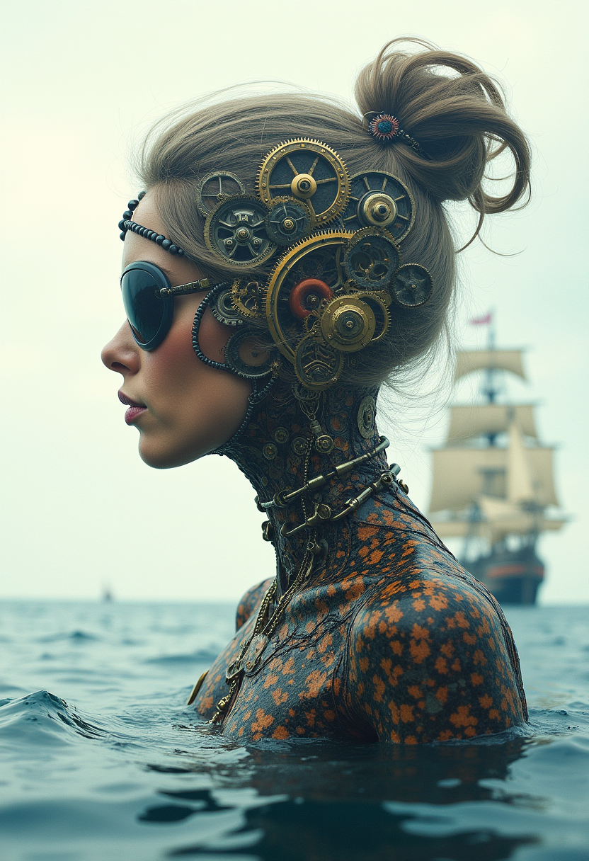 Detailed, masterpiece, professional, double exposure, amateur photography, artist expression, surreal, phantasmal clockwork pirate ship, pirate cyborg, feminine, interlocking gears, pirate theme, jolly roger flag flying in background, mechanical eyepatch, cowboy shot, ocean