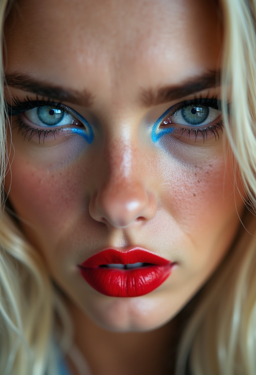 Extreme close up of an 18yr old swedish blonde supermodel's face . Her face fills the picture. She looks very angry. She is wearing red lipstick. Her lips are full and pouty. She has blue eyeshadow. Her eyes are blue. She has long eye lashes with lots of mascara and eye-liner