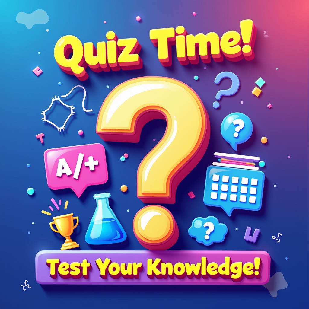 Create a vibrant and eye-catching thumbnail for a quiz video. The design should feature a bold, colorful gradient background in blue, purple, and pink. Place a large, central question mark with a 3D effect or glowing outline to make it stand out. Surround the question mark with icons or illustrations of math symbols, history books, science beakers, and word puzzles. Add the text "Quiz Time!" at the top in a fun, playful font, in a bright color like yellow or white for contrast. Include a secondary text line at the bottom that says "Test Your Knowledge!" in a slightly smaller, complementary font. Incorporate small icons of a clock, light bulb, and trophy to suggest challenge, thinking, and winning. Use a border or shadow effect to frame the thumbnail and enhance its visual appeal. The overall design should be dynamic and energetic, capturing the excitement and fun of taking quizzes.